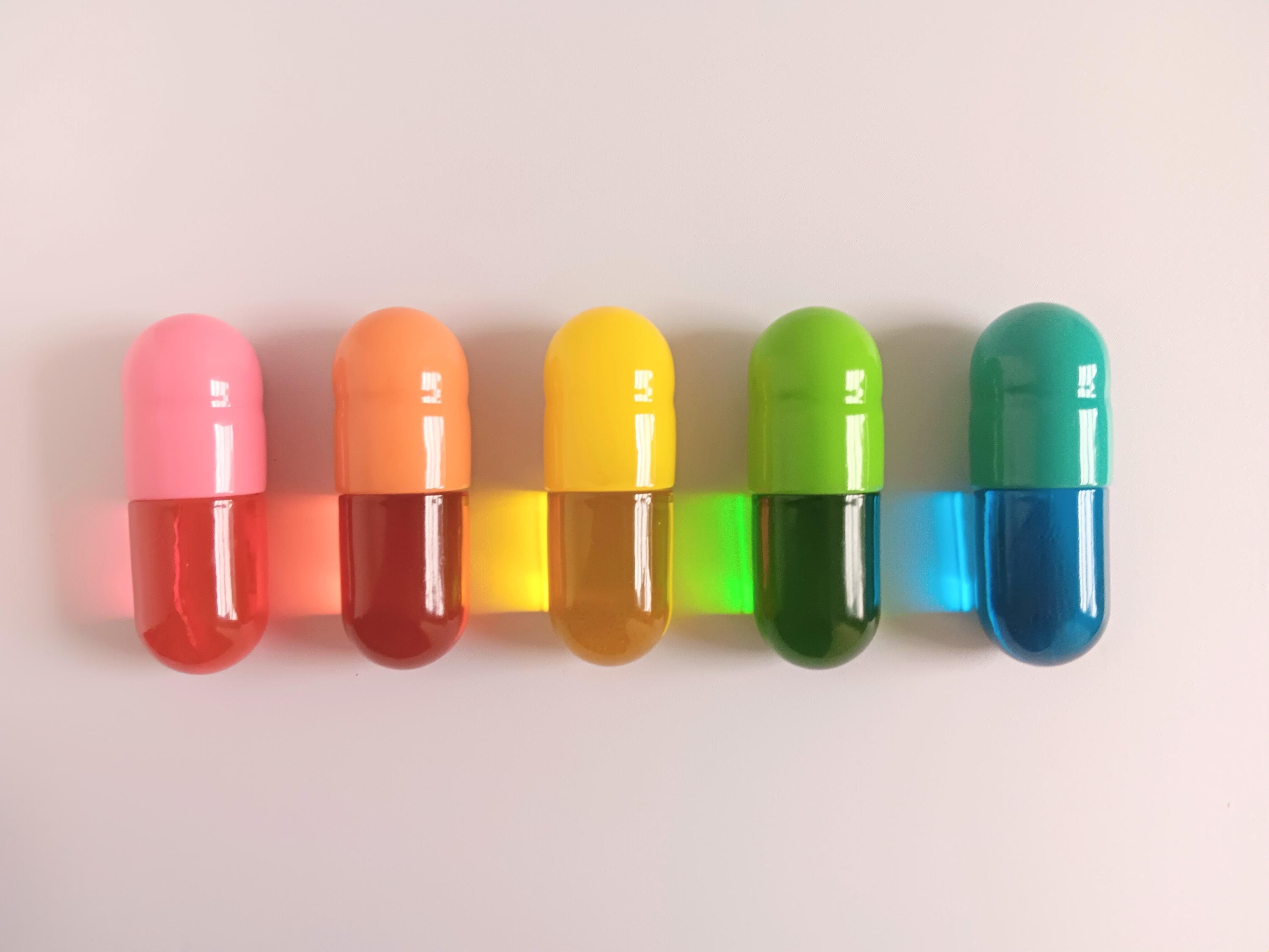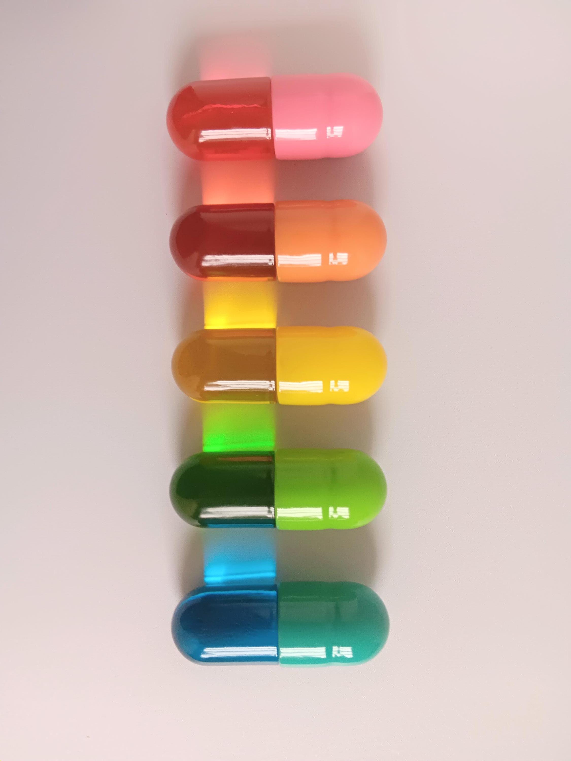 1 Large Pill Capsule Sculpture with 2 halves that have translucent and opaque colors. They have flat backs and can have a sawtooth hanger attached for hanging. These beautiful solid sculptures are fun art pieces that can be displayed individually or multiples in an arrangement of colors. This colorful ornament is fun for any décor and sure to brighten any space.