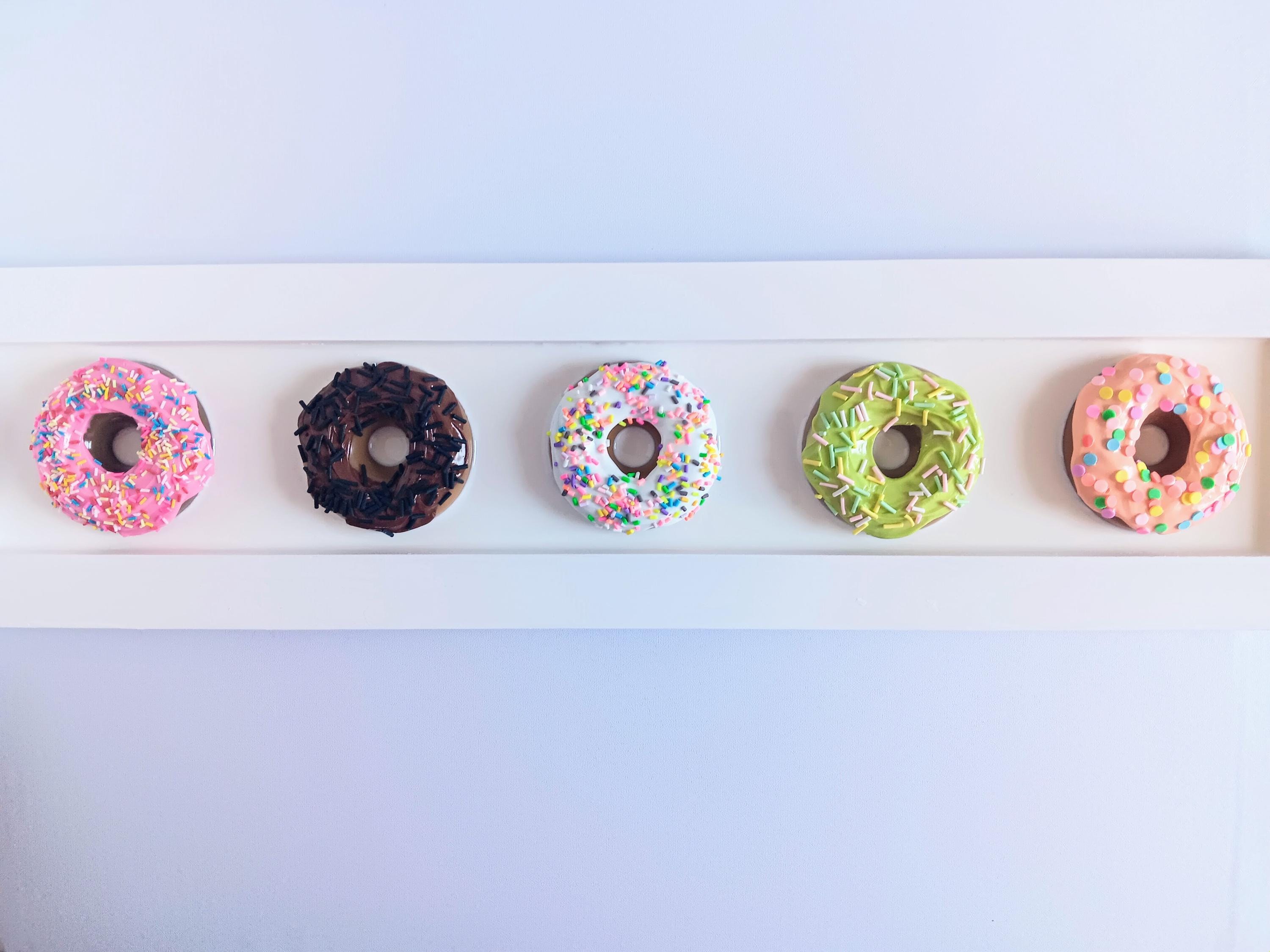 Set of 5 donut sculptures mounted on white birch wood cradle canvas. Donuts are secured in a resin setting and are each as glossy in real life as they appear in photos. No additional frame needed. Each donut is approximately 3 inches of hand cast non-toxic resin, carefully pigmented and decorated to create a beautiful and fun palette of whimsy to lighten up any home, office, nursery, or restaurant space. Variety and placement carefully selected to compliment each other and look great collectively.