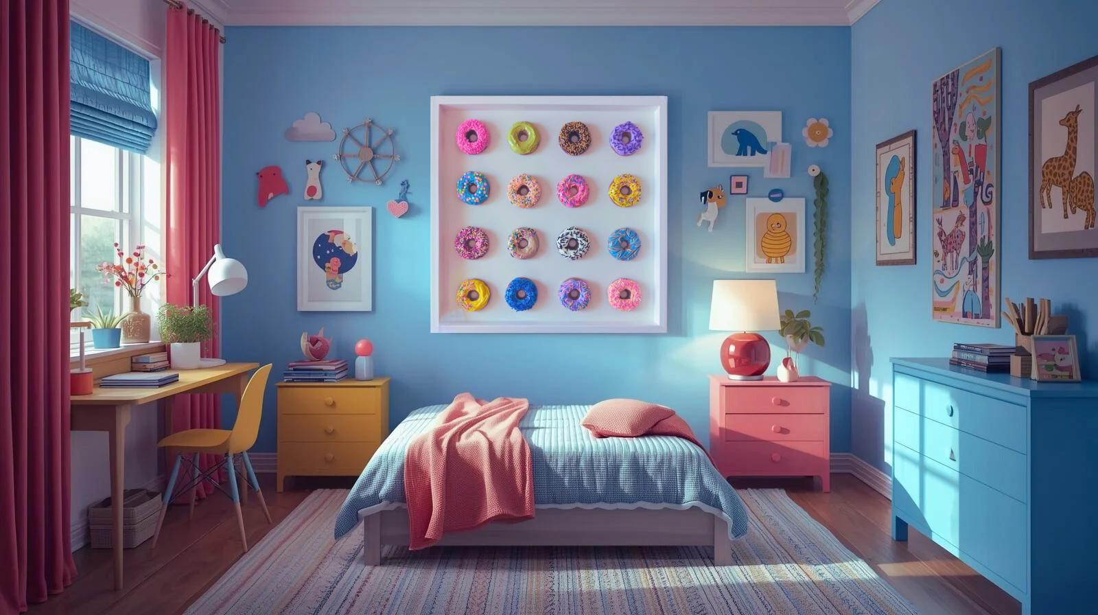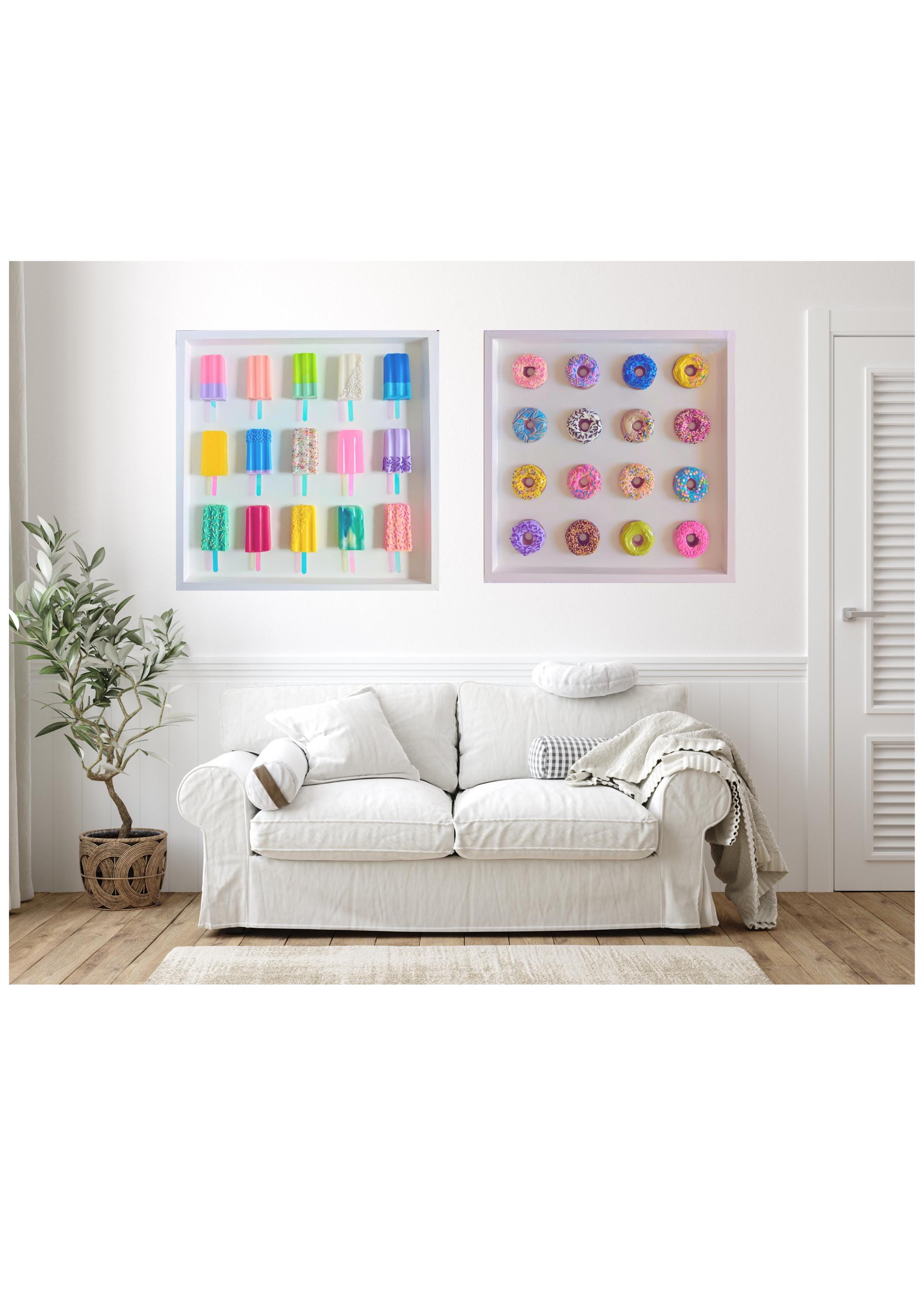 Multi-colored assortment of colorful donut sculptures mounted on a white birch open frame. No additional frame needed. Each donut is approximately 3 inches of hand cast non-toxic resin, carefully pigmented and decorated to create a beautiful and fun array of colors and whimsy to lighten up any home, office or restaurant space.