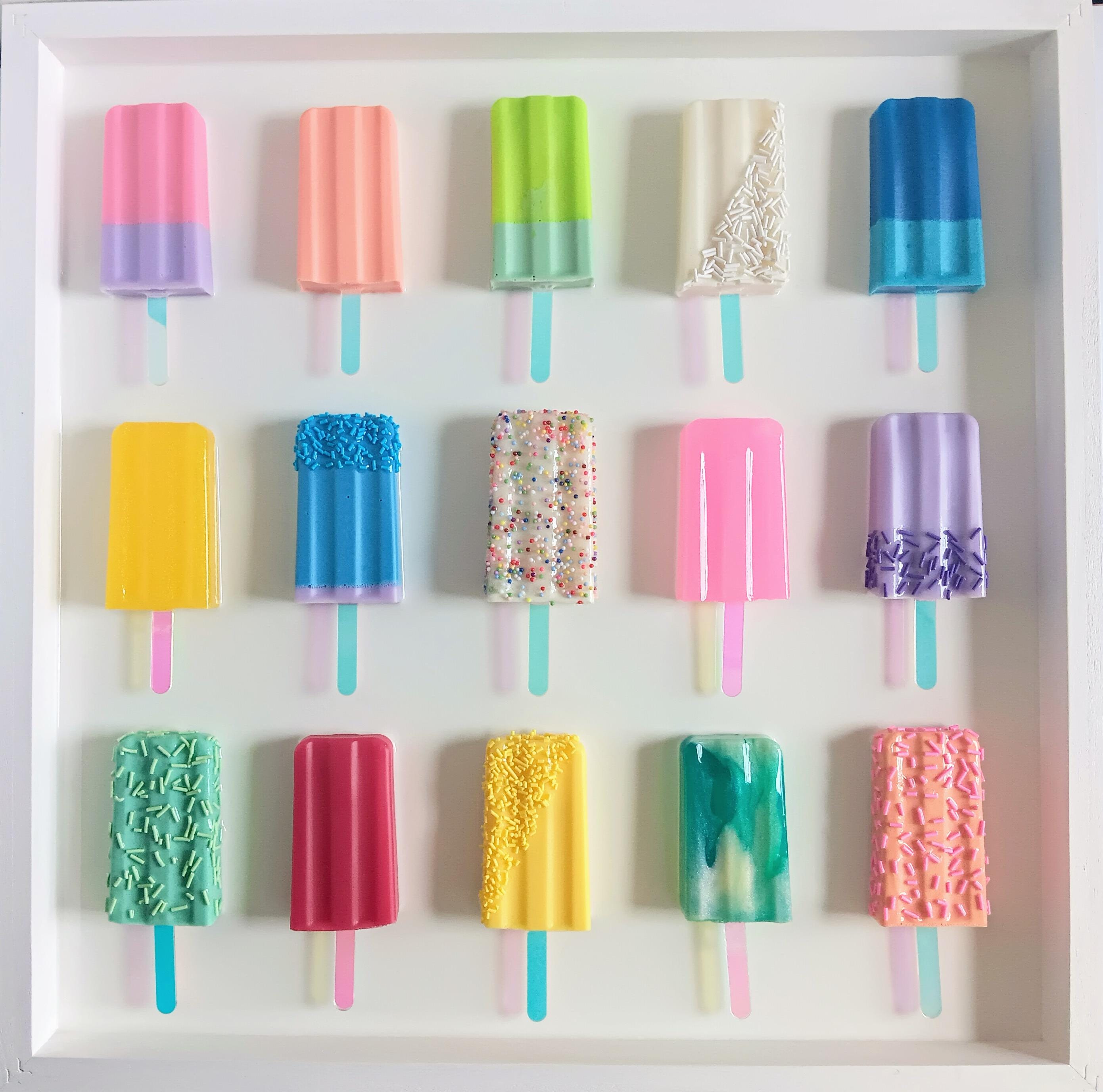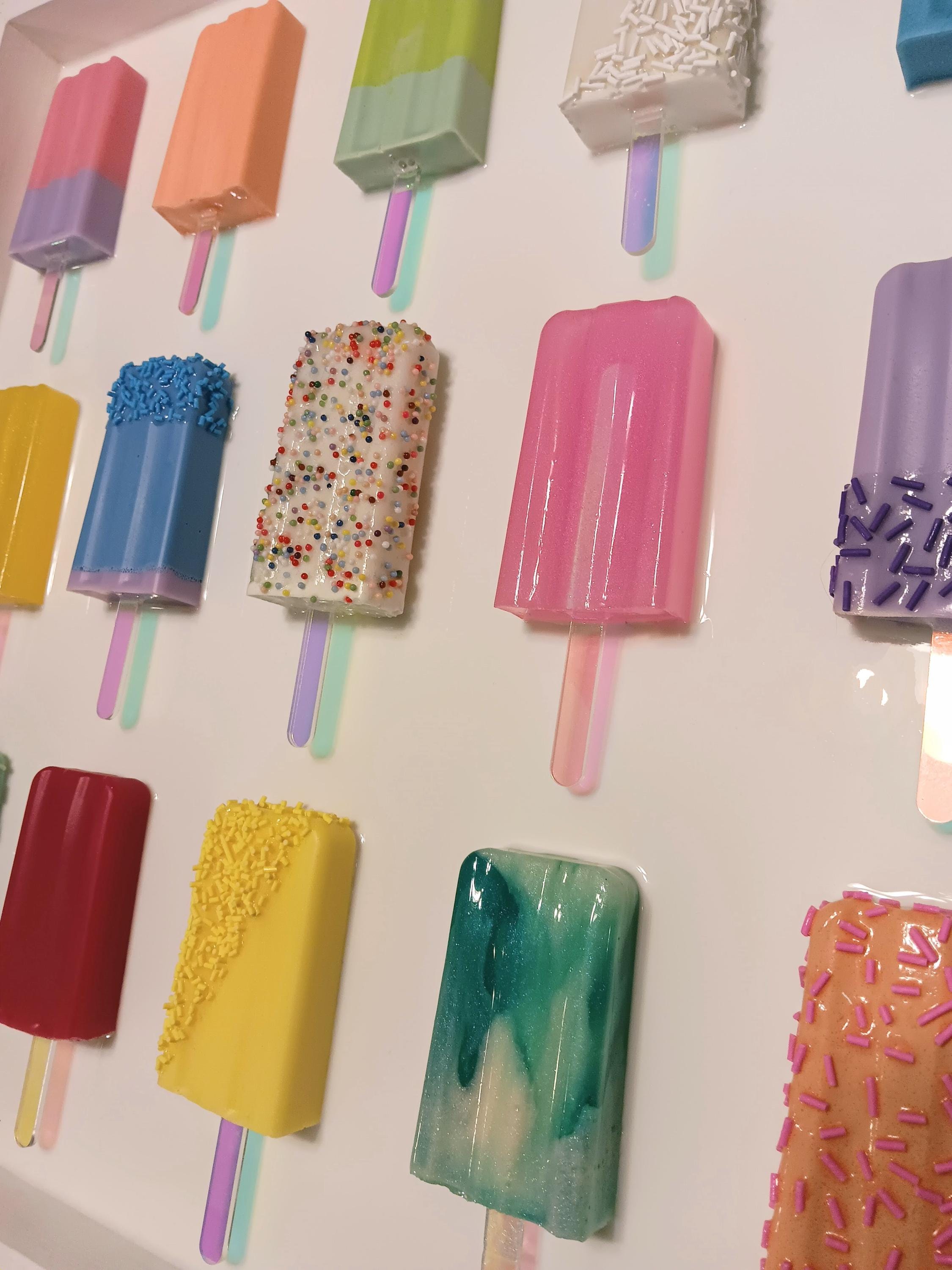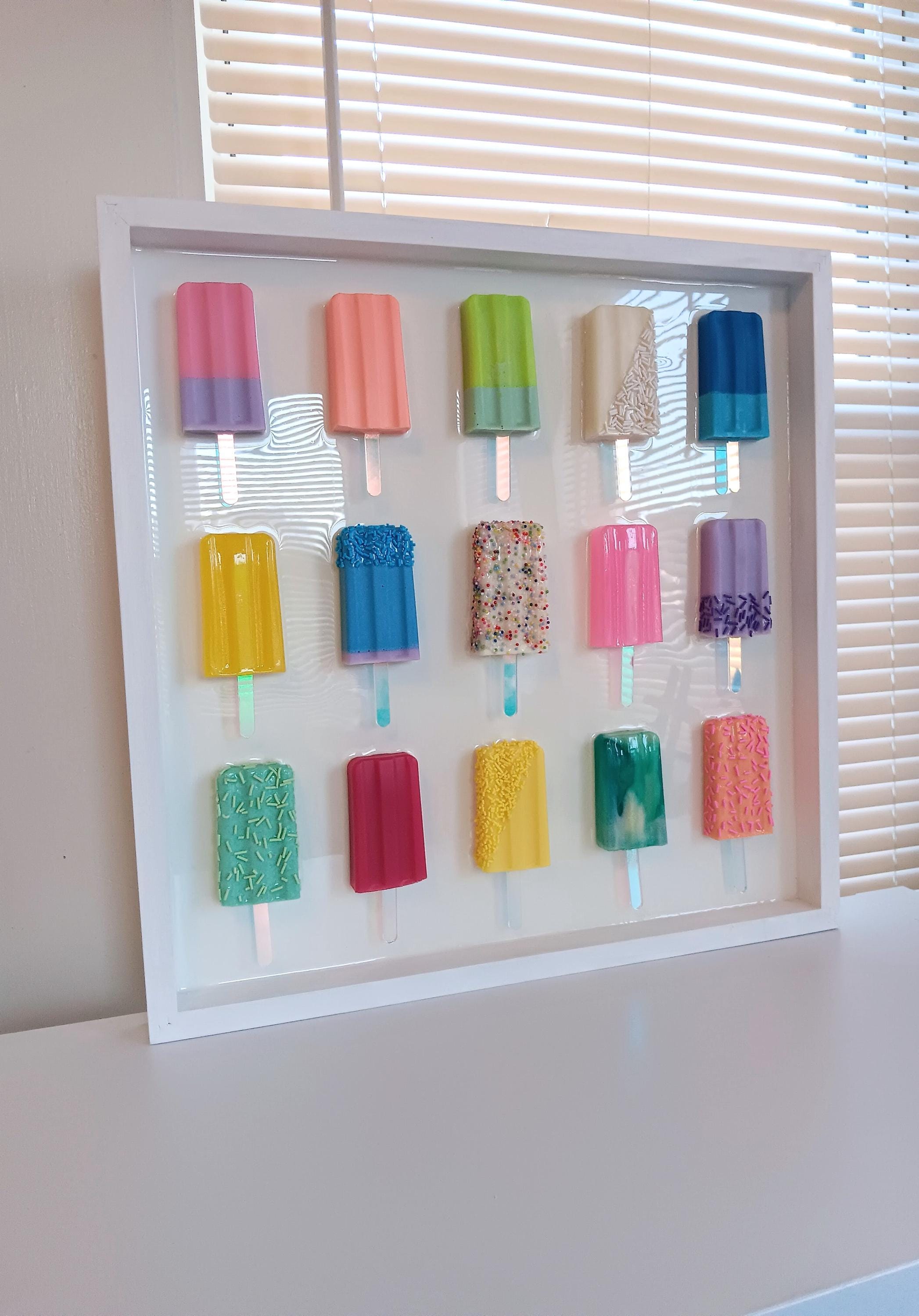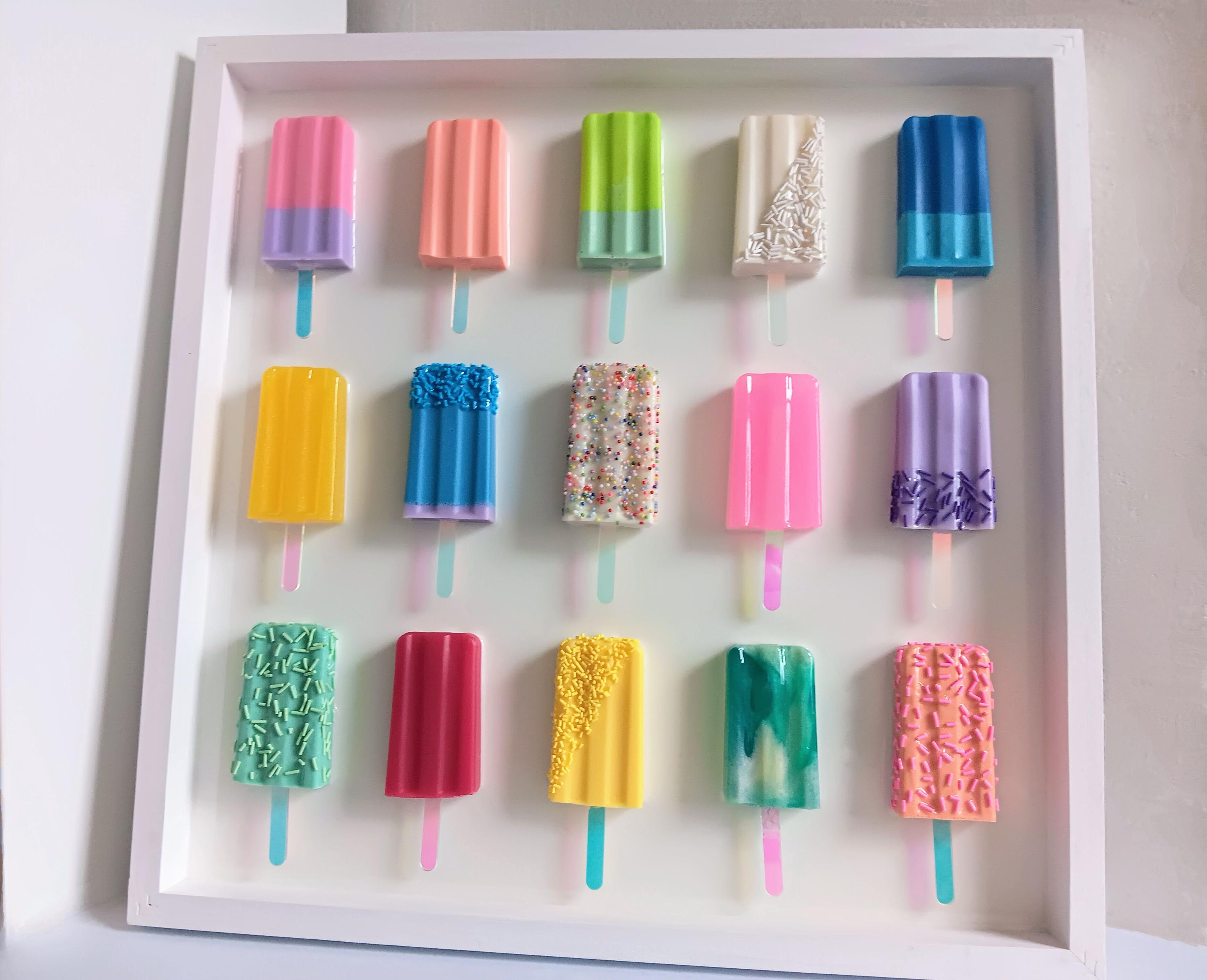 Colorful assortment of popsicle sculptures with iridescent popsicle sticks mounted on a white birch open frame. Popsicle sculptures placed in a white resin setting that makes the piece glossy, secure, and easier to maintain. No additional frame needed. Ready to hang with hardware included and attached for you. Each popsicle is hand cast, carefully pigmented and decorated to create a beautiful and fun array of colors and whimsy to lighten up any home, office or restaurant space.