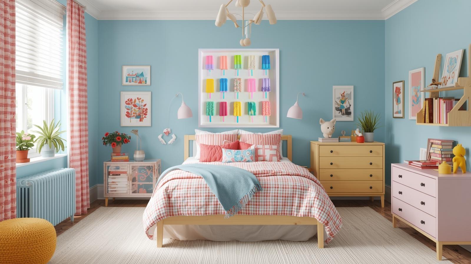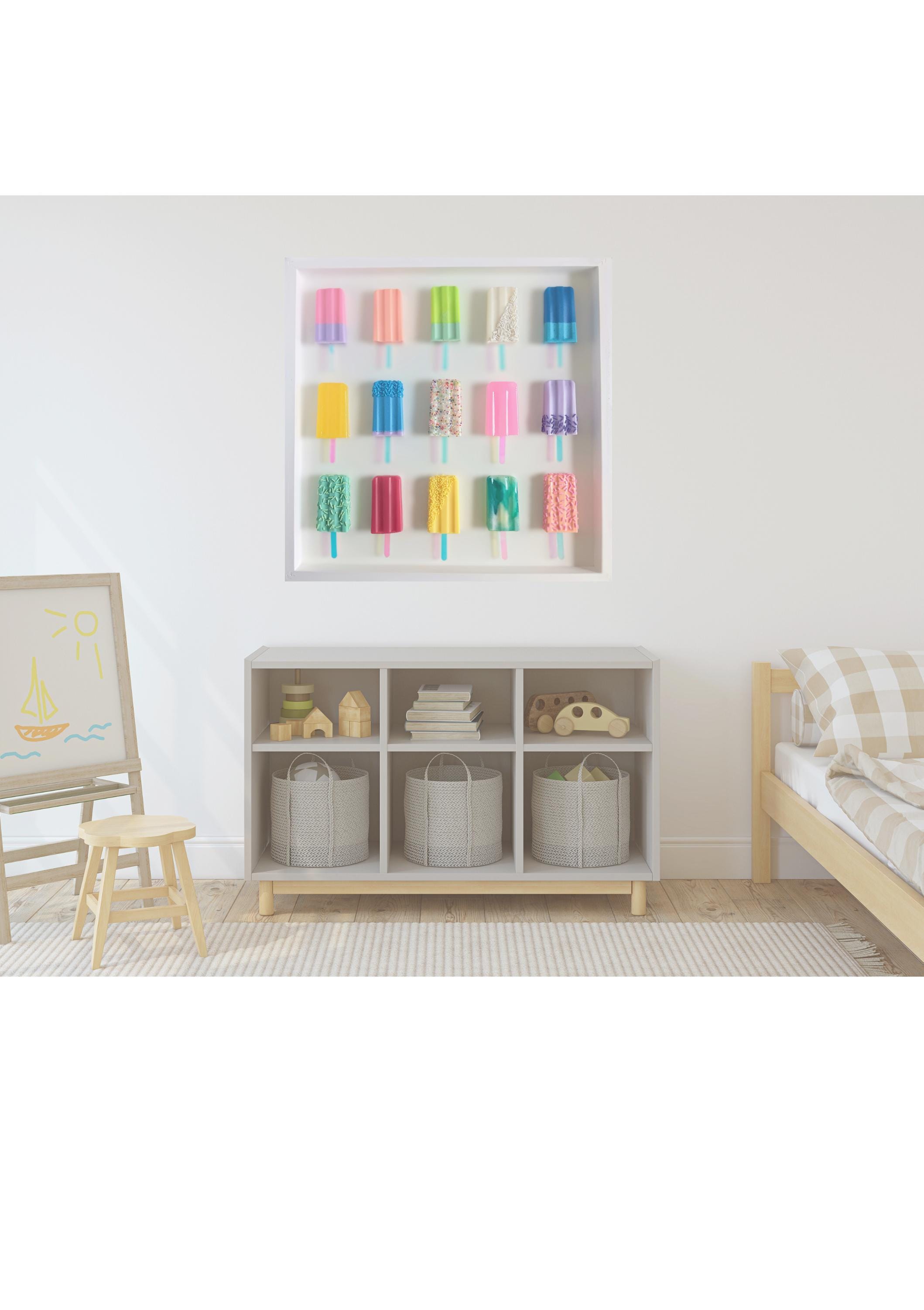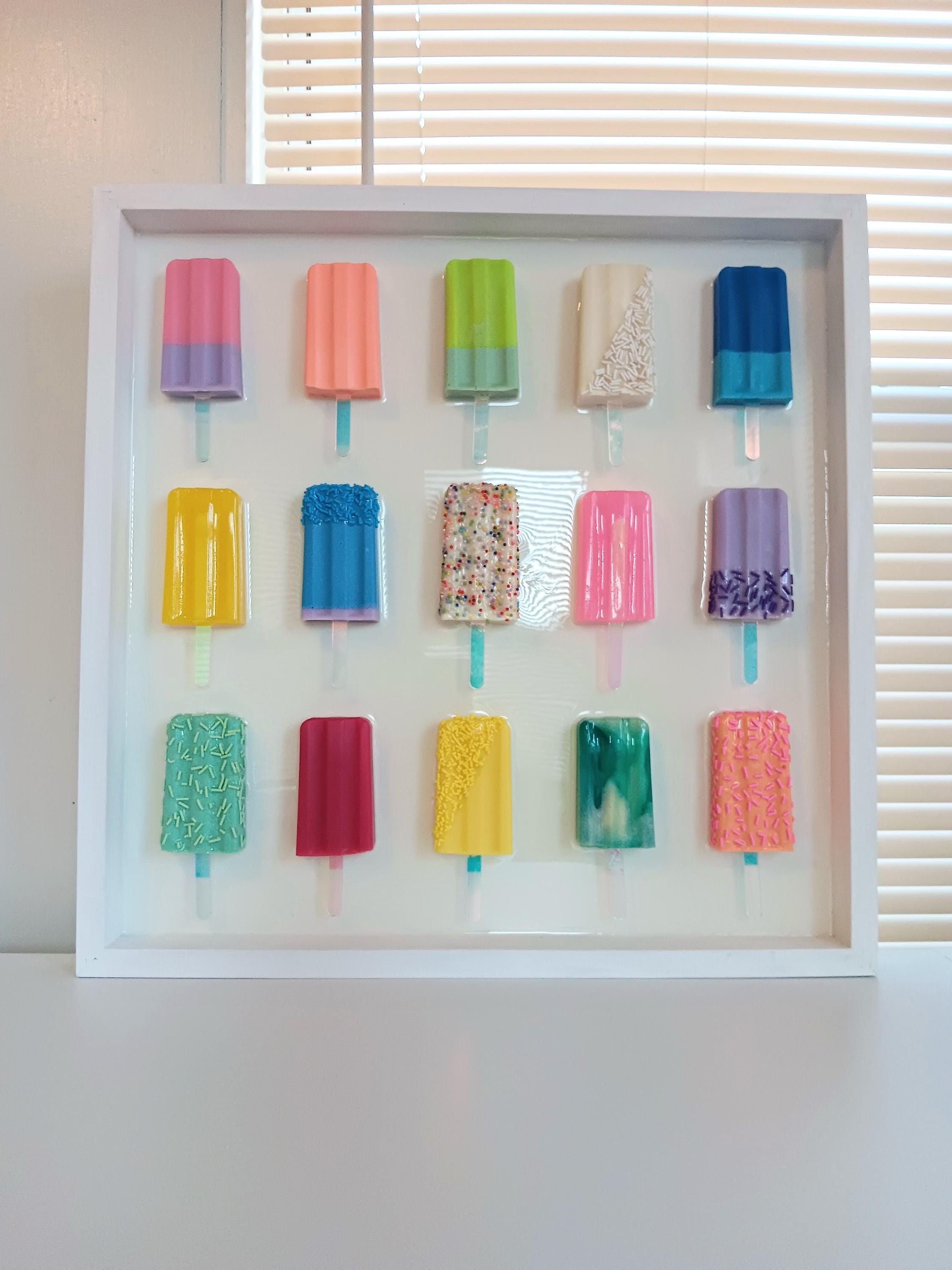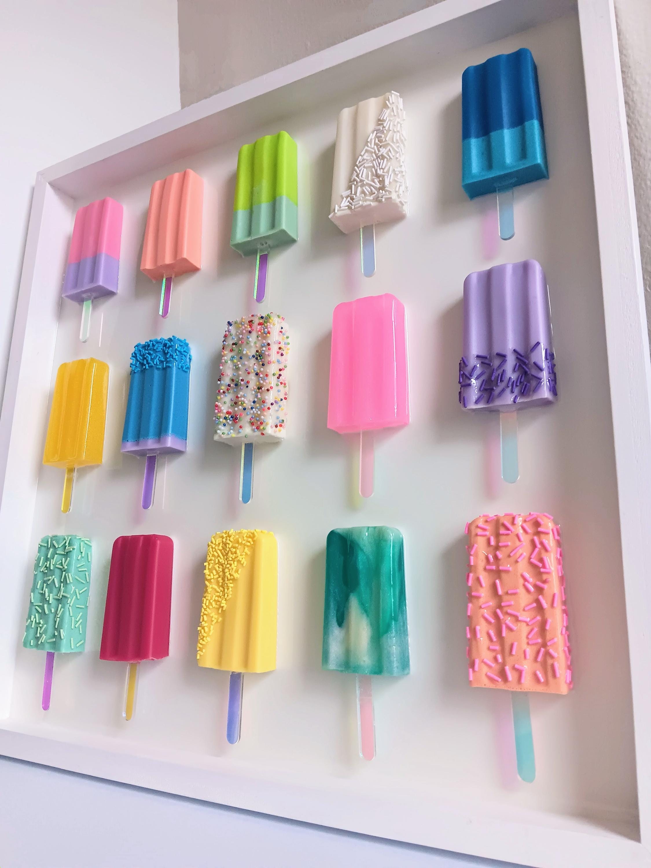 Colorful assortment of popsicle sculptures with iridescent popsicle sticks mounted on a white birch open frame. Popsicle sculptures placed in a white resin setting that makes the piece glossy, secure, and easier to maintain. No additional frame needed. Ready to hang with hardware included and attached for you. Each popsicle is hand cast, carefully pigmented and decorated to create a beautiful and fun array of colors and whimsy to lighten up any home, office or restaurant space.