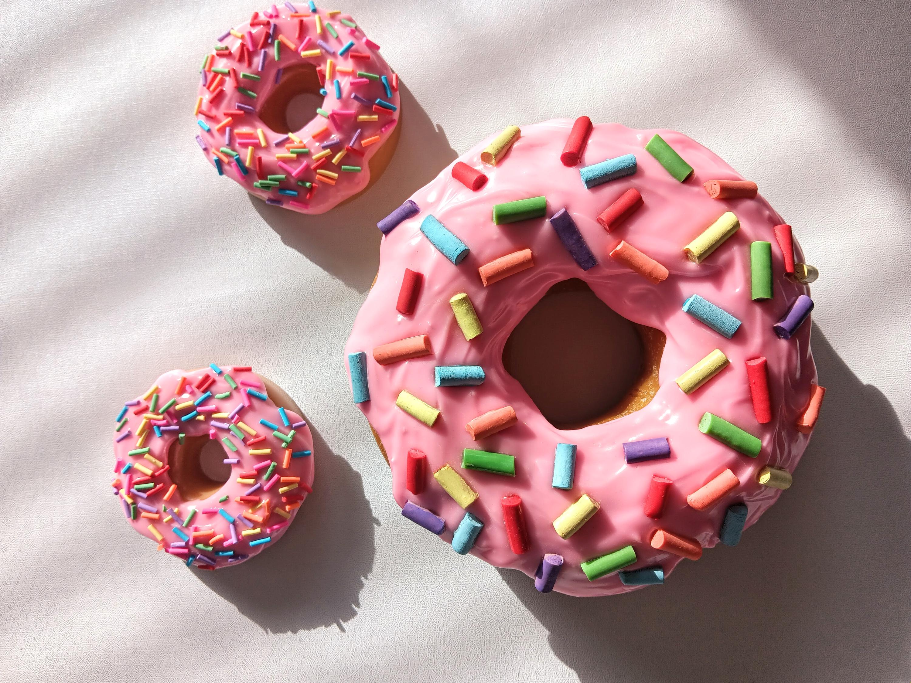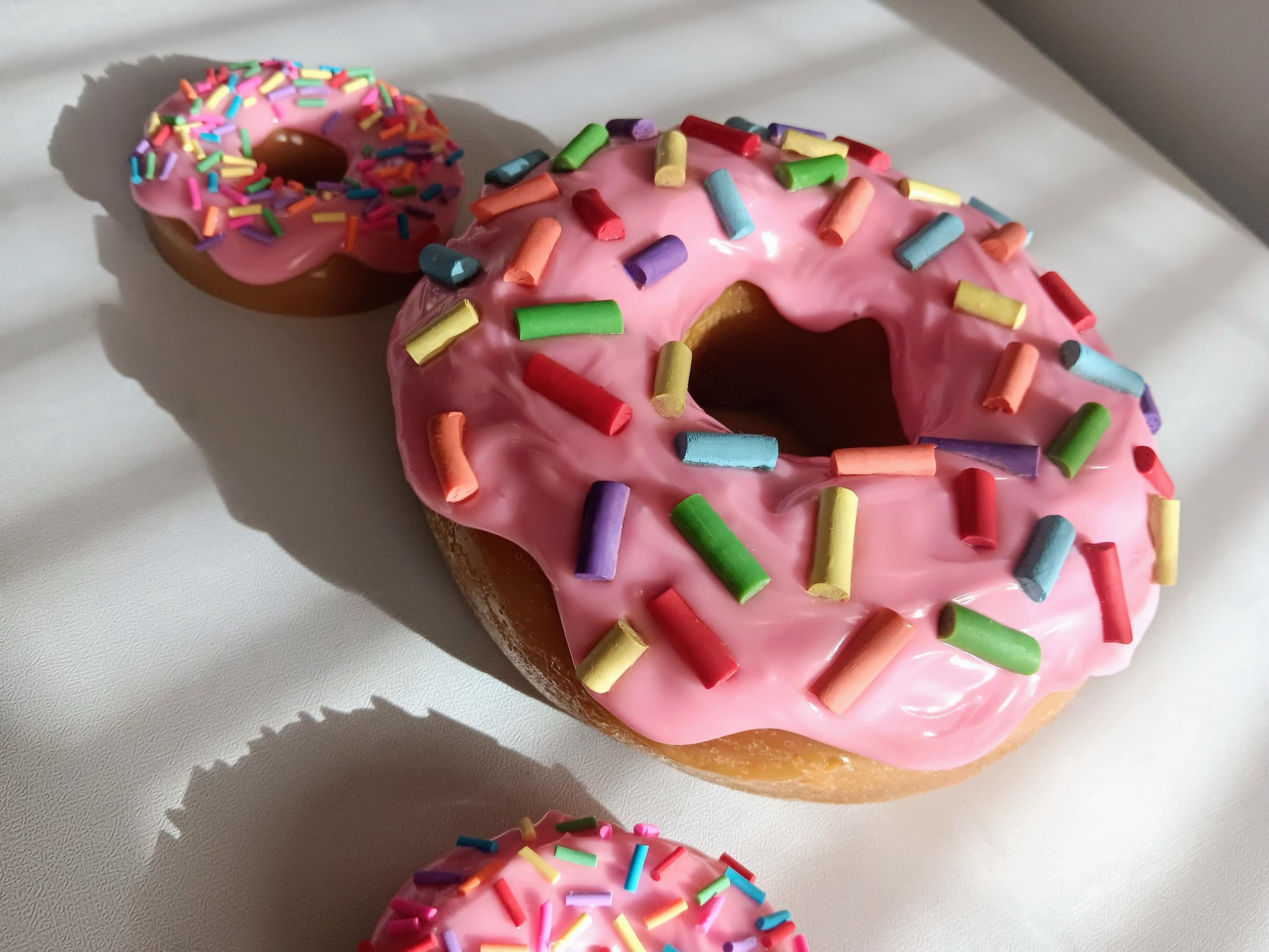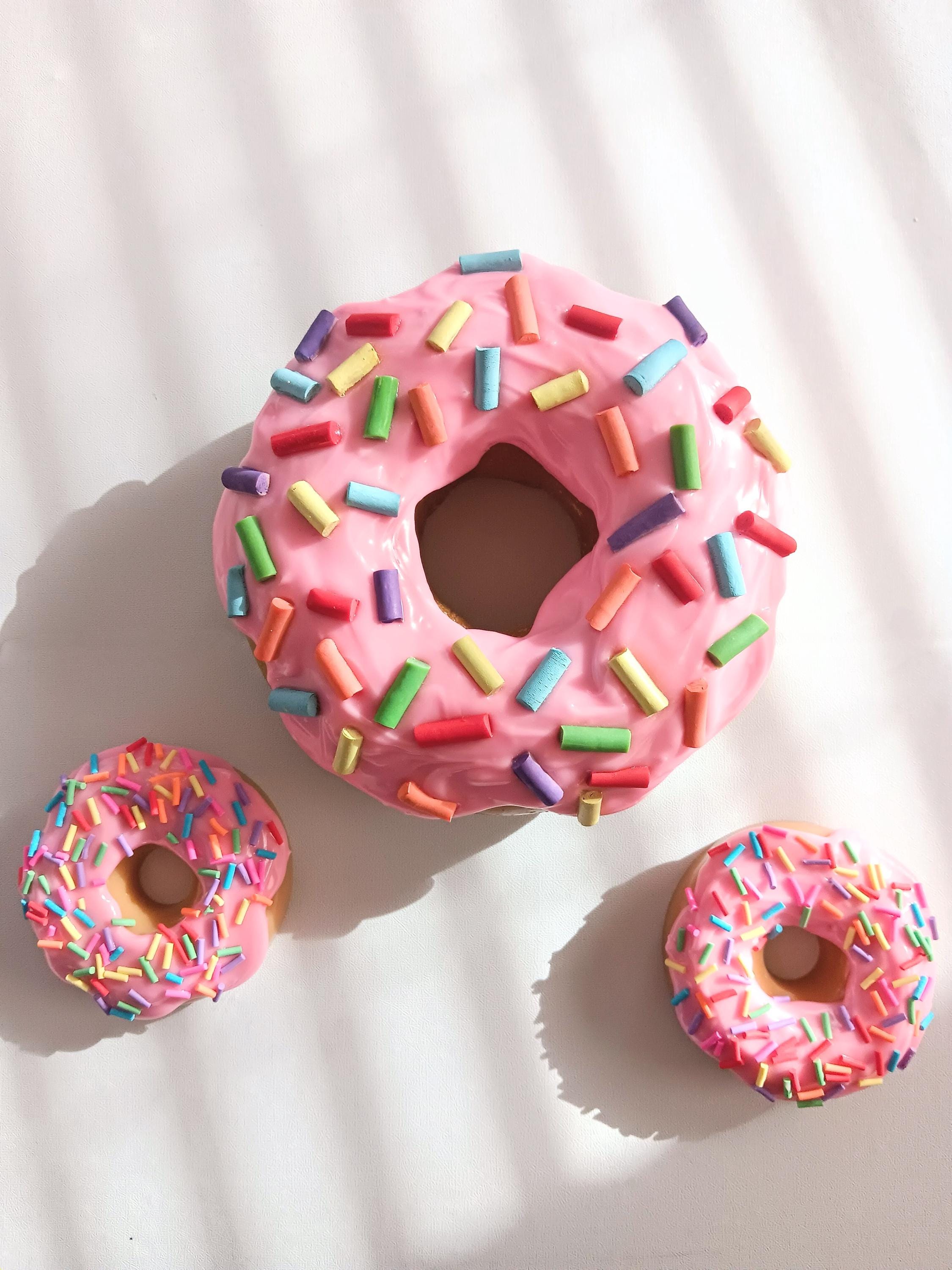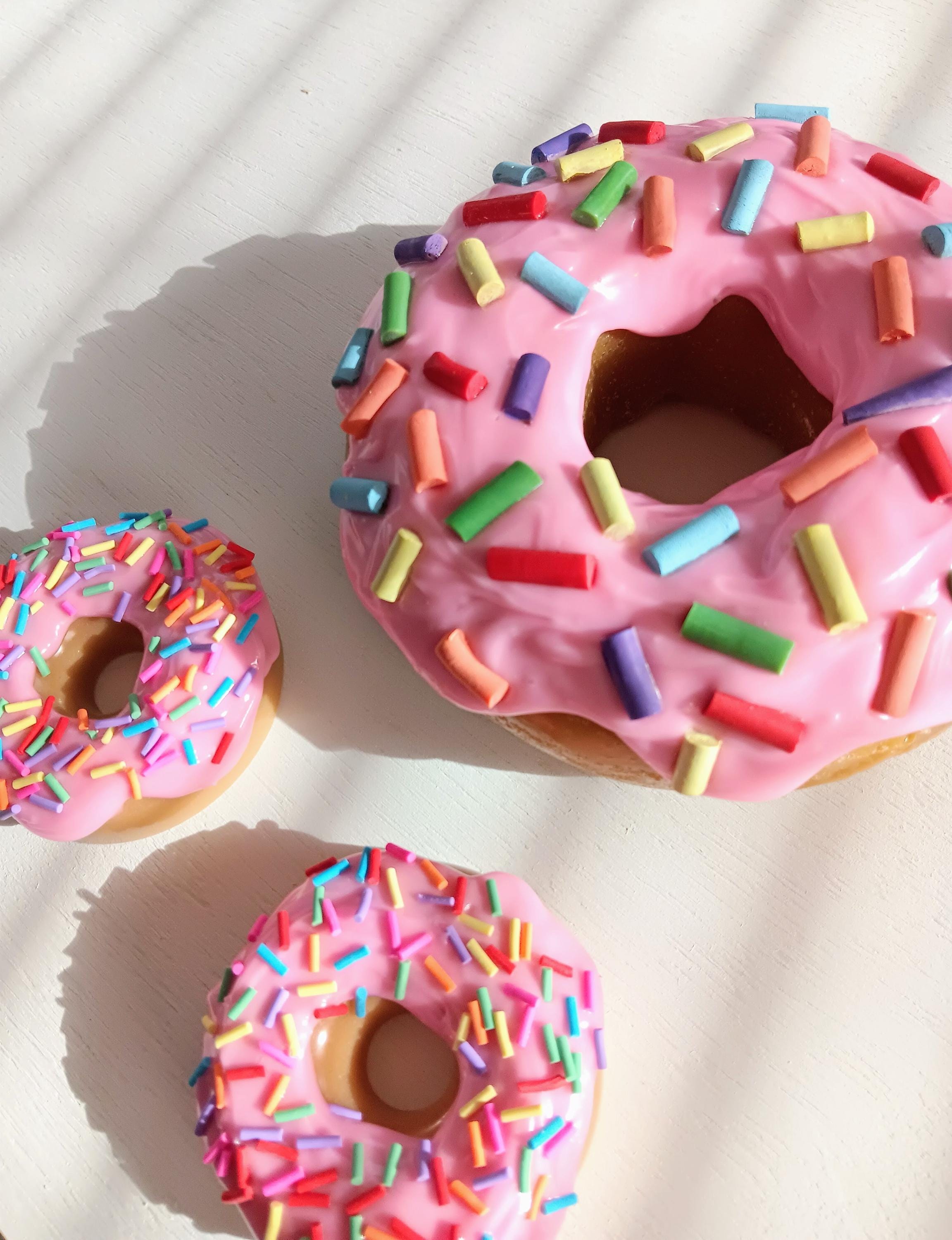 Single large pink frosted donut sculpture with rainbow sprinkles. Donut is approximately 5 1/2 inches wide and 2 inches thick hand cast non-toxic resin, with drippy resin frosting pigmented and decorated to create a beautiful piece that is fun and whimsical to lighten up any home, office, nursery, or restaurant space.
